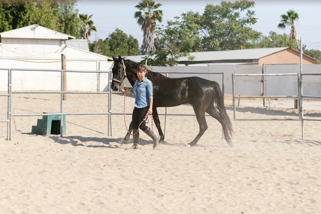 - Walk with the horse in a normal leading position.
